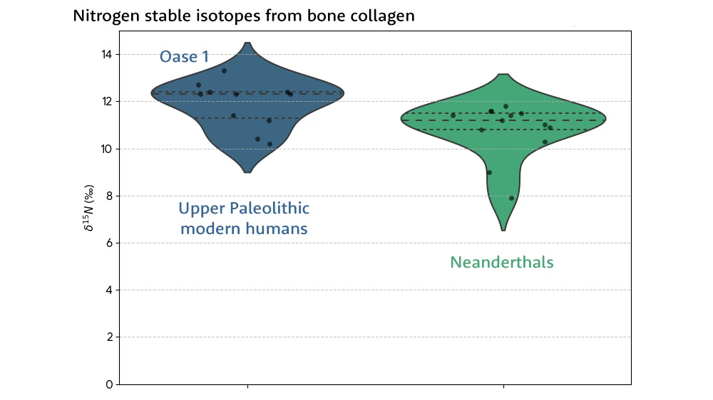 The highest value of nitrogen-15 found by Richards and Trinkaus was from the Oase 1 mandible, representing an individual who lived around 40,000 years ago in Romania. We know today from the ancient genome of Oase 1 that this individual was a fifth or sixth generation descendant of at least one Neanderthal, with around to 10% Neanderthal genetic ancestry. He happened to belong to a group that had little or no input into today’s European people. And his collagen had more nitrogen-15 content than the most extreme wolves and hyenas.