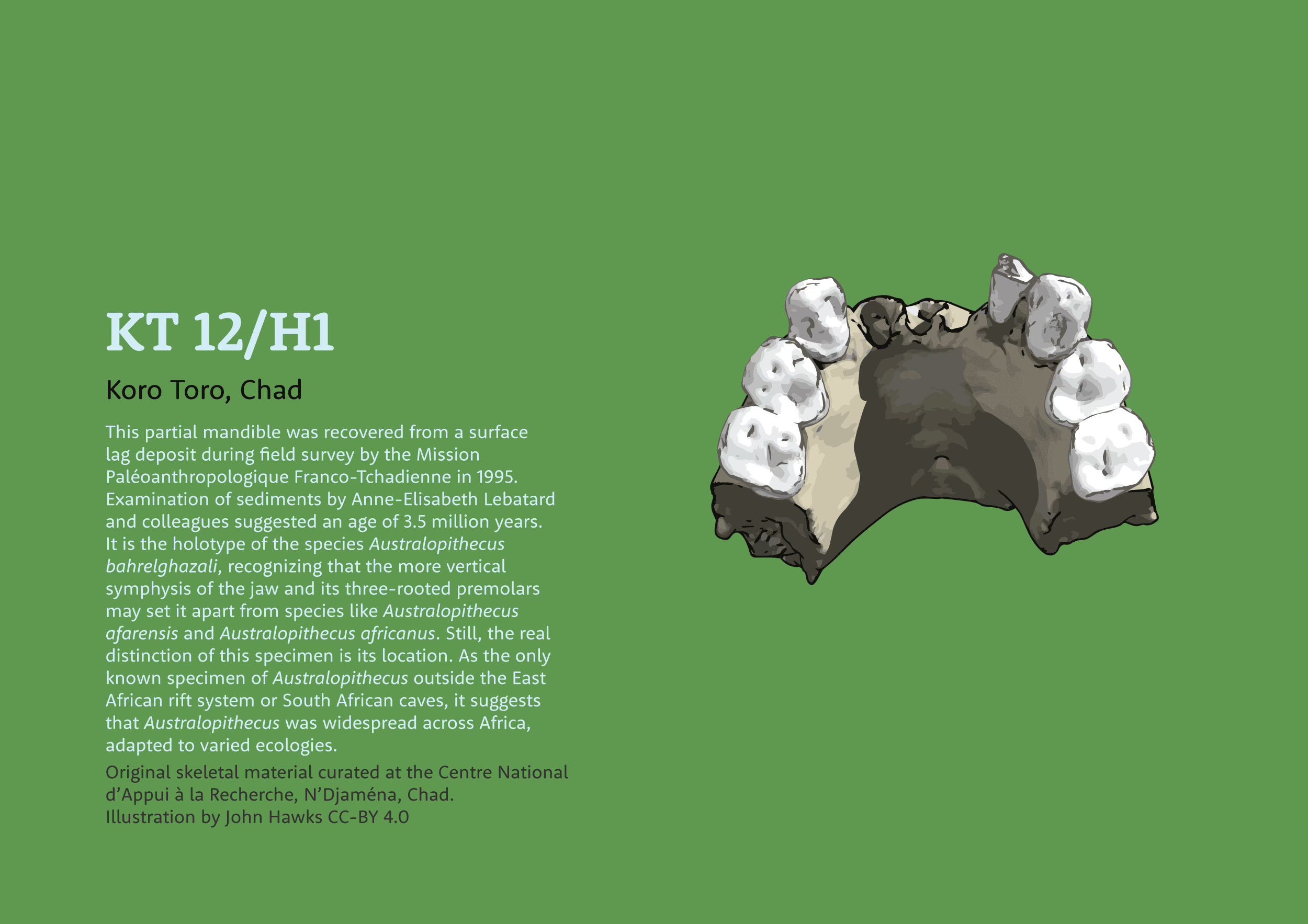 Before researchers found Toumaï, they found Abel. Near the eastern extreme of the Djurab Desert is a settlement called Koro Toro, which today is the location of a maximum security prison. The Mission Paléoanthropologique Franco-Tchadienne in 1994 and 1995 surveyed fossil deposits to the west of Koro Toro, finding a number of places with fossils either on the surface or eroded from the underlying layers during the last highstand of Mega-Lake Chad. Some of those fossils were from a locality numbered KT12, including a partial hominin jaw and an isolated premolar, now estimated between 3.8 million and 3.2 million years old. Michel Brunet nicknamed the jaw with the Biblical name, “Abel”.