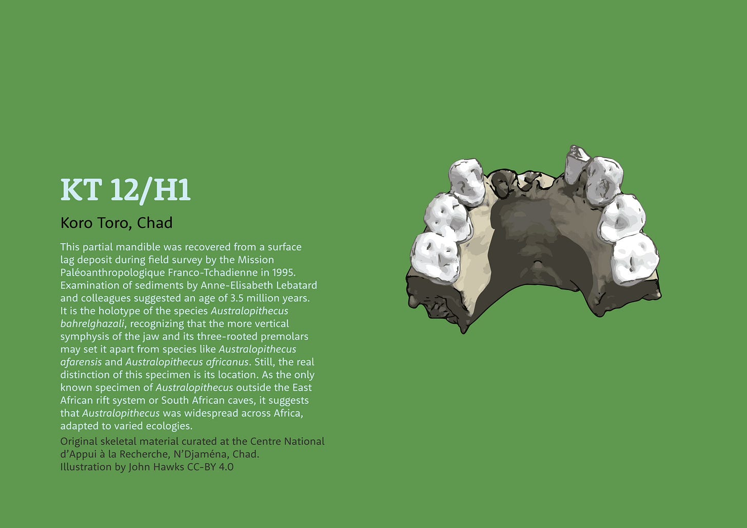 The KT12 jaw is very similar to jawbones of Lucy’s species, Australopithecus afarensis, in most ways. But a couple of details differ, including its three-rooted third premolars and a less sloping, more vertical chin region. Brunet and collaborators proposed recognizing the jaw as a different species, Australopithecus bahrelghazali. Many researchers continue to recognize the fossil within A. afarensis, already known from sites across Ethiopia, Kenya, and Tanzania from the same time period.