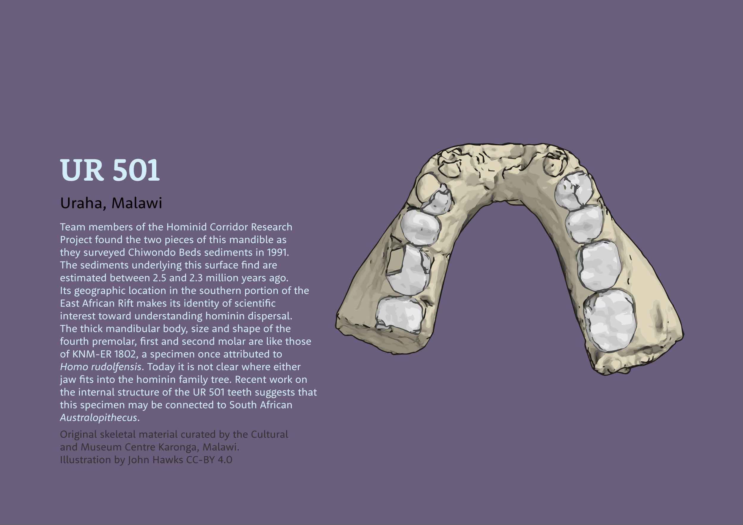 It was at Uraha that the first fossil hominin discovery was made by a team led by Friedemann Schrenk in 1991. The UR 501 fossil is a partial mandible dating to around 2.4 million years ago. The team suggested that the jaw is an early representative of Homo, emphasizing its similarity to the KNM-ER 1802 jawbone from Koobi Fora, estimated around 1.9 million years old. Later work by Clément Zanolli has suggested that the jaw may better be attributed to Australopithecus; the size and form of its teeth and mandibular corpus lie in the range of overlap of the two genera.