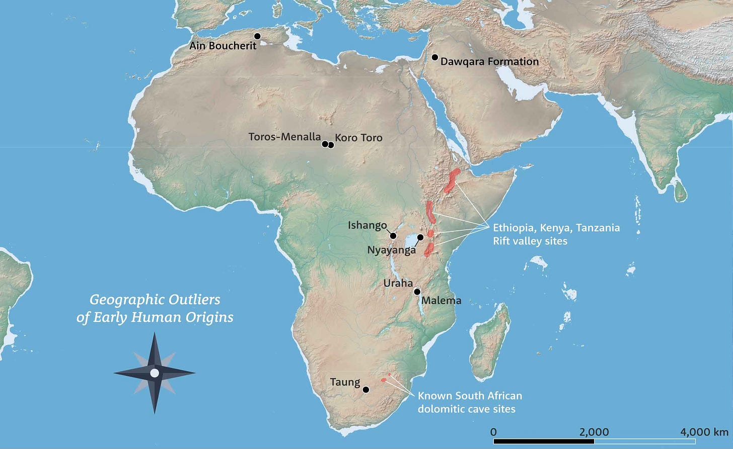 Every textbook discusses the reasons why these two areas have yielded so many fossil discoveries. The downward ratcheting of Earth’s crust within the East African Rift System has given rise to rivers and large lakes, preserving fossils within sedimentary layers and later yielding them up to erosion. The dolomitic caves of South Africa were habitats for ancient hominins and predators, keeping their bones like time capsules across millions of years. Still, these geological circumstances are not unique. Many other parts of Africa have favorable situations for the formation of fossil and archaeological sites.