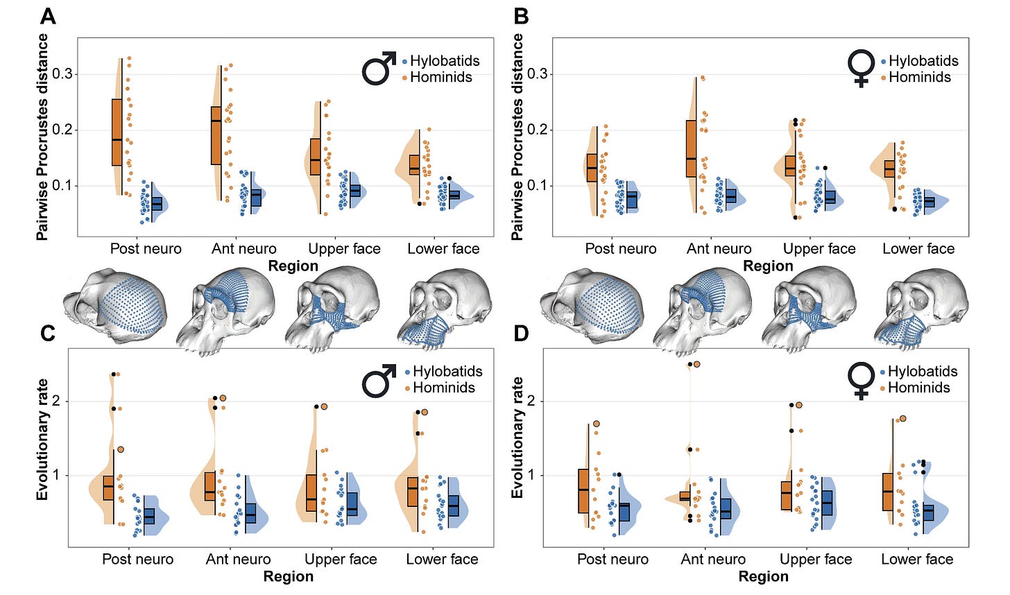 Their figure showing the summary of results of shape difference and evolutionary rates in the hominids (great apes and humans) and hylobatids (gibbons and siamangs) is a powerful statement about the slow evolution in gibbons, greater shape variation in great apes, and moderately faster evolutionary rate in great apes.
