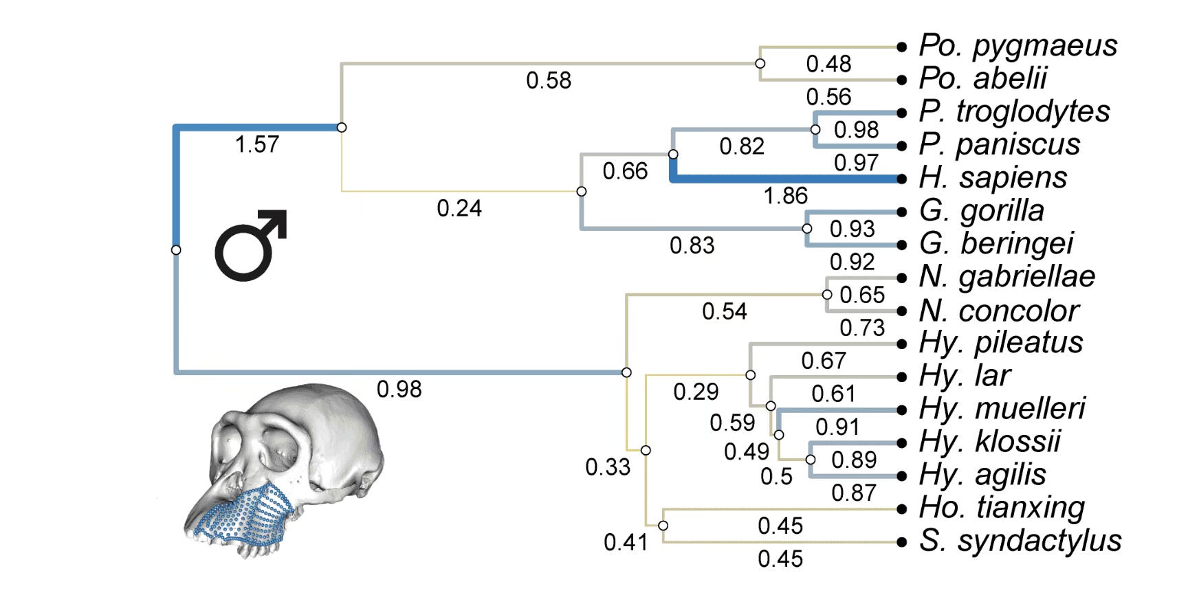 This study did not involve fossils or the differences between humans and extinct hominins. That’s not a bad thing. Fossil samples are nonexistent for most of the branches of great apes and hylobatids. Even fossil hominins which have numerous fossils for some species are generally not well-enough preserved to enable this kind of very dense array of semi-landmarks to be collected. Moreover, the tree of relationships of fossil hominins is messy and uncertain. Aside from Neanderthals and Denisovans, it is really not possible to nail down branch lengths well enough to make reliable comparisons of evolutionary rate.