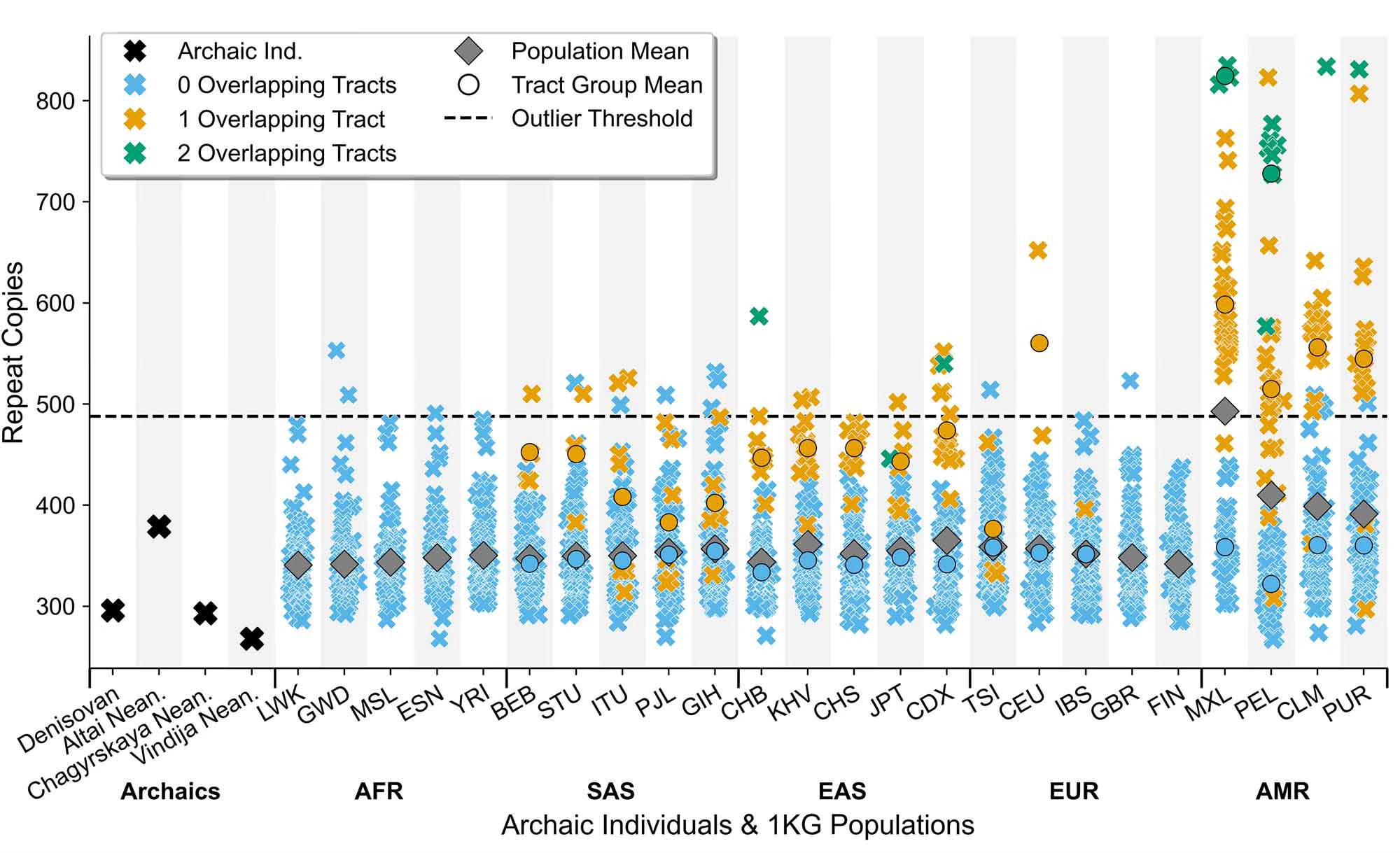 One more thing: Living people across Eurasia who have the Denisovan 72-kb haplotype do have a little bit longer VNTR regions than average. But people in the Americas have vastly more copies of the repeat—in some cases more than 800 compared to an average closer to 350.