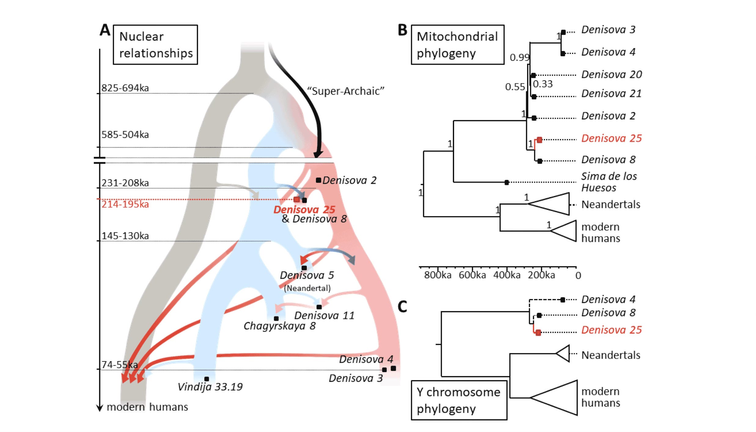 Meanwhile, Denisova 3 and the hybrid Denisova 16 both already showed that mixture between these groups and Neanderthals was happening a lot. Denisova 25 adds a deeper time dimension to this mixture, from even earlier Neanderthal groups. The genome also confirms the ancient passage of “superarchaic” ancestry into the early Denisovans.