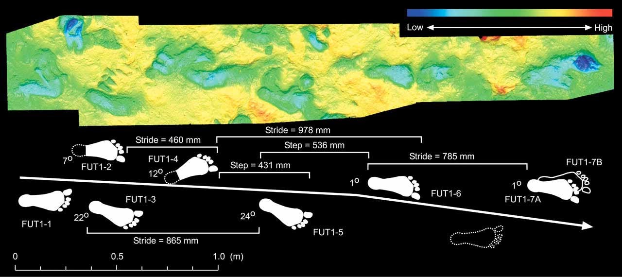 By far the most extensive data came from the Upper Footprint Layer at FwJj14E, where at least 8 different individuals made trails. Matthew Bennett and coworkers in 2009 focused on a long trail of seven prints, two of which seemed overlapping, like a stutter-step. Later fieldwork exposed a larger surface, showing that this single trail was actually two overlapping trails, made by two different individuals. Hatala and coworkers writing in 2016 designated these two trails as FUT1A and FUT1B, and both were part of a larger group of trackways, most proceeding in a roughly parallel direction.